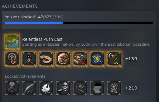 Keep in mind most achievements are not something you can easily obtain. Hell, even after all these hours I am not even half-way there yet. The difference is, though, that unlike most other games where achievements are just a mark of progress that just so happens to appear on the storefront, in EU4 they are entirely valid playstyle to base your runs upon.